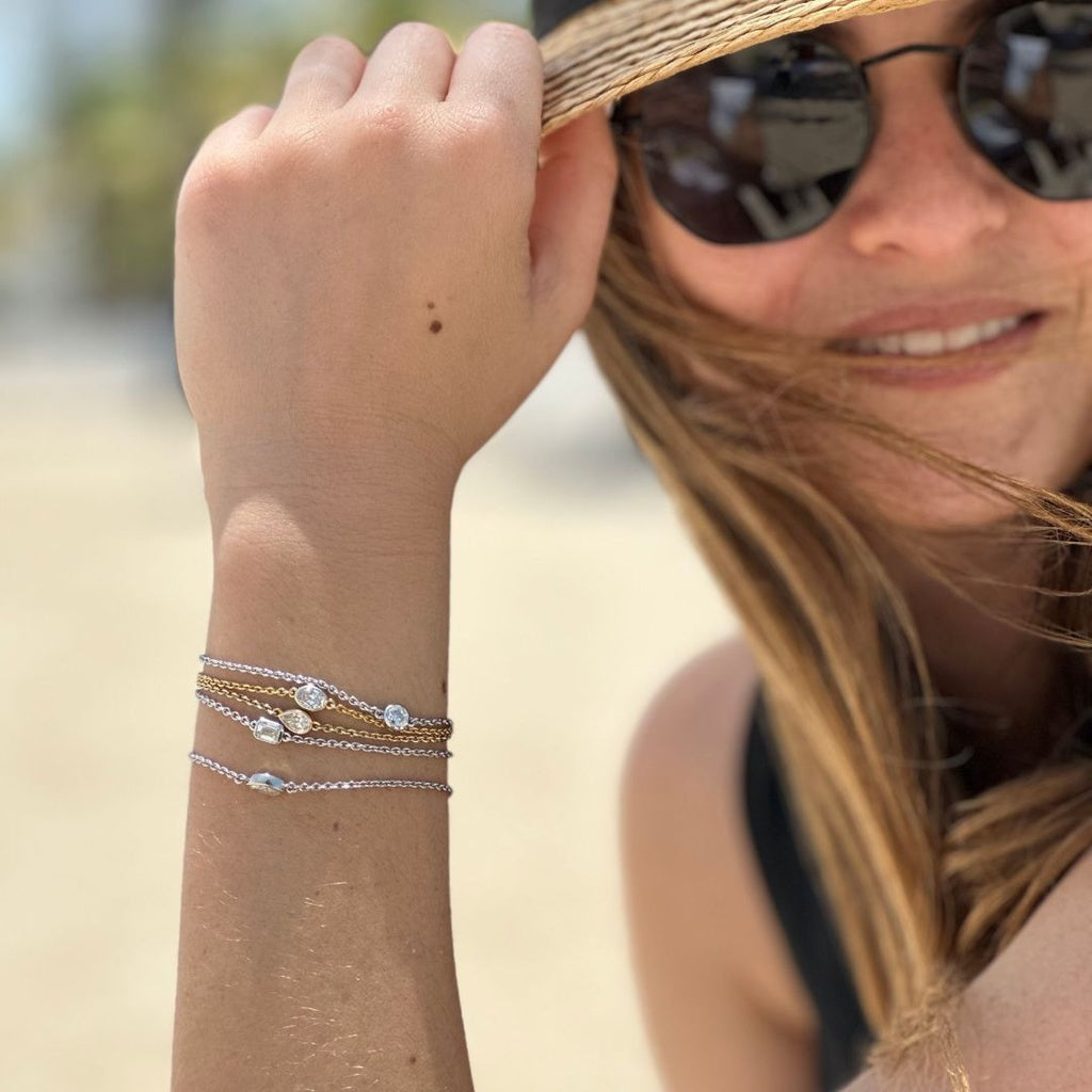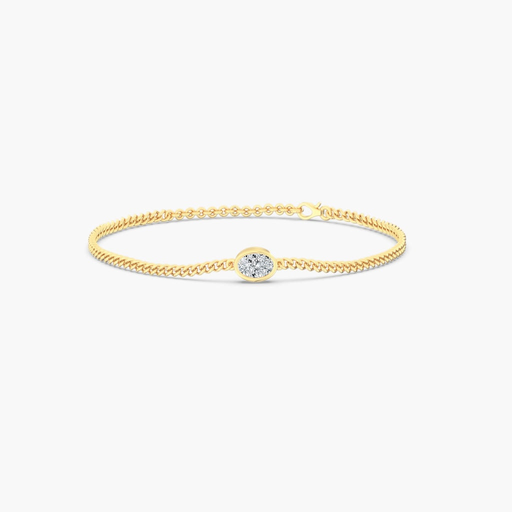 Refined 14K gold bracelet showcasing a beautiful oval diamond in a classic bezel setting. This timeless piece features a 0.50 carat diamond with F color and VS+ clarity, offering exceptional brilliance and clarity. The bezel setting securely encases the stone while enhancing its natural sparkle with optimal light reflection. Ideal for both everyday wear and special occasions, this bracelet blends elegant design with lasting quality, making it a versatile and sophisticated addition to any jewelry collection.