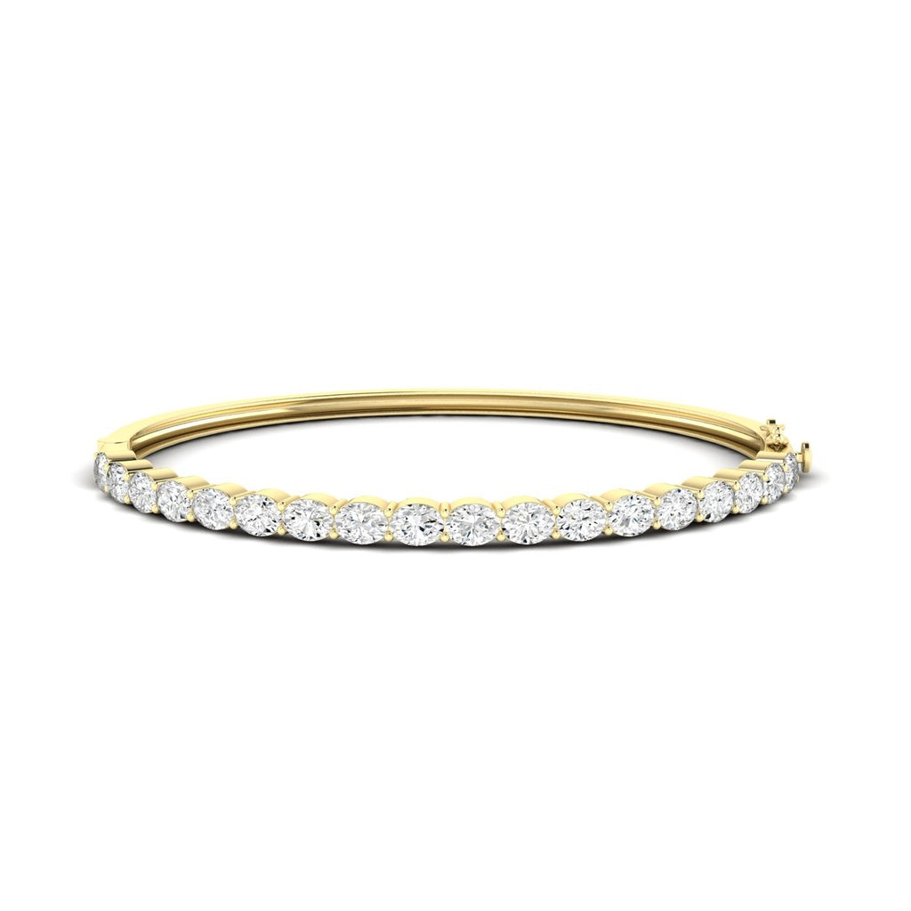 Sleek and sophisticated, this 14K gold bangle bracelet showcases oval-cut diamonds set in a modern east-west layout. With a total diamond weight of 2.75 carats, the horizontal arrangement creates a refined, elongated look that enhances the bracelet’s fluid elegance. The smooth gold bangle offers a clean, structured silhouette, while the oval diamonds add softness and radiant sparkle. Crafted in solid 14K gold, this piece delivers a fresh take on classic luxury perfect for elevating both everyday style and special occasions.