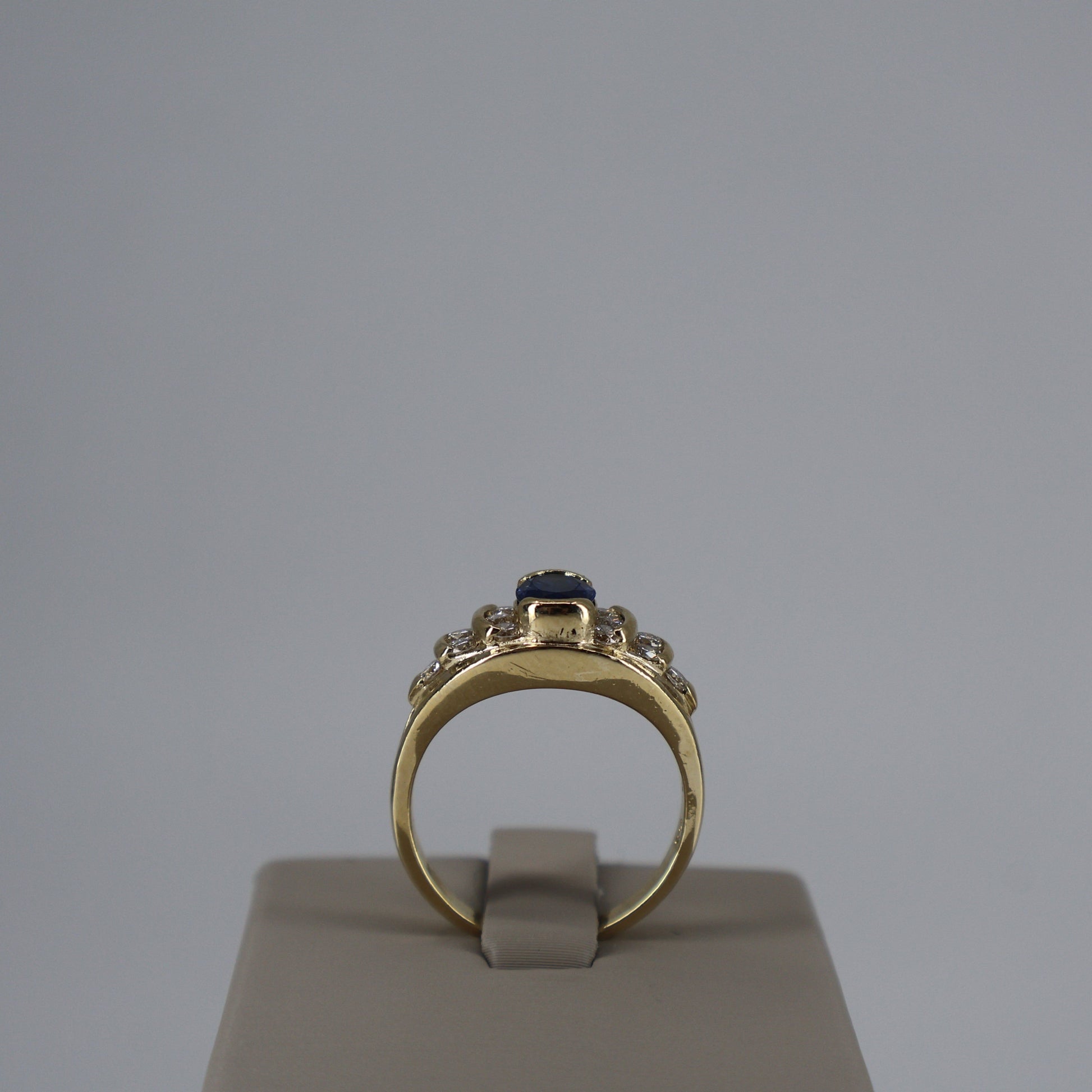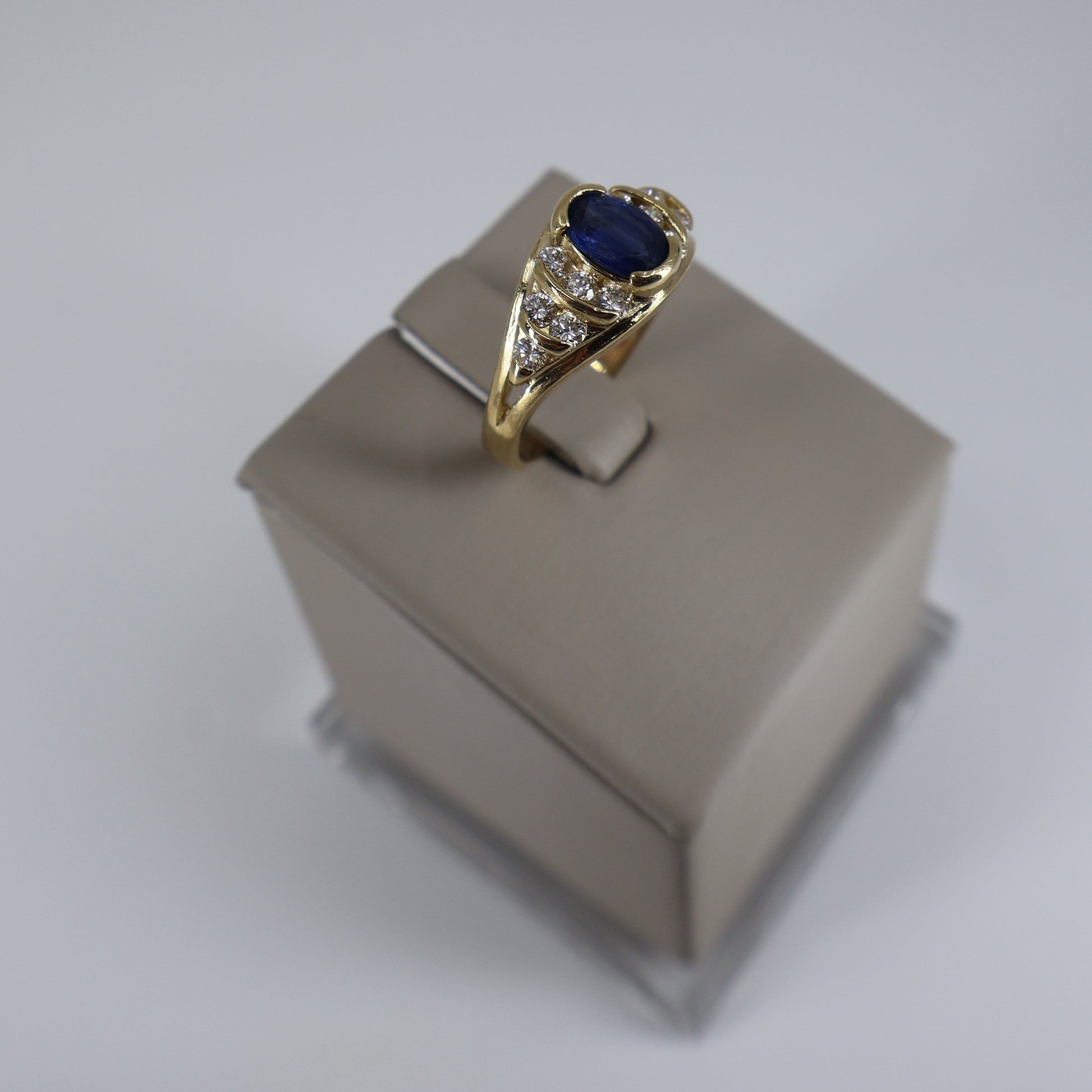 Crafted in 14K yellow gold, this oval sapphire ring features a semi-bezel dome setting that accentuates the vibrant blue sapphire at its center. Twelve round diamonds are channel-set around the band, adding refined brilliance and durability. The combination of secure mounting and elegant design offers both lasting beauty and comfortable wear for a sophisticated statement piece.