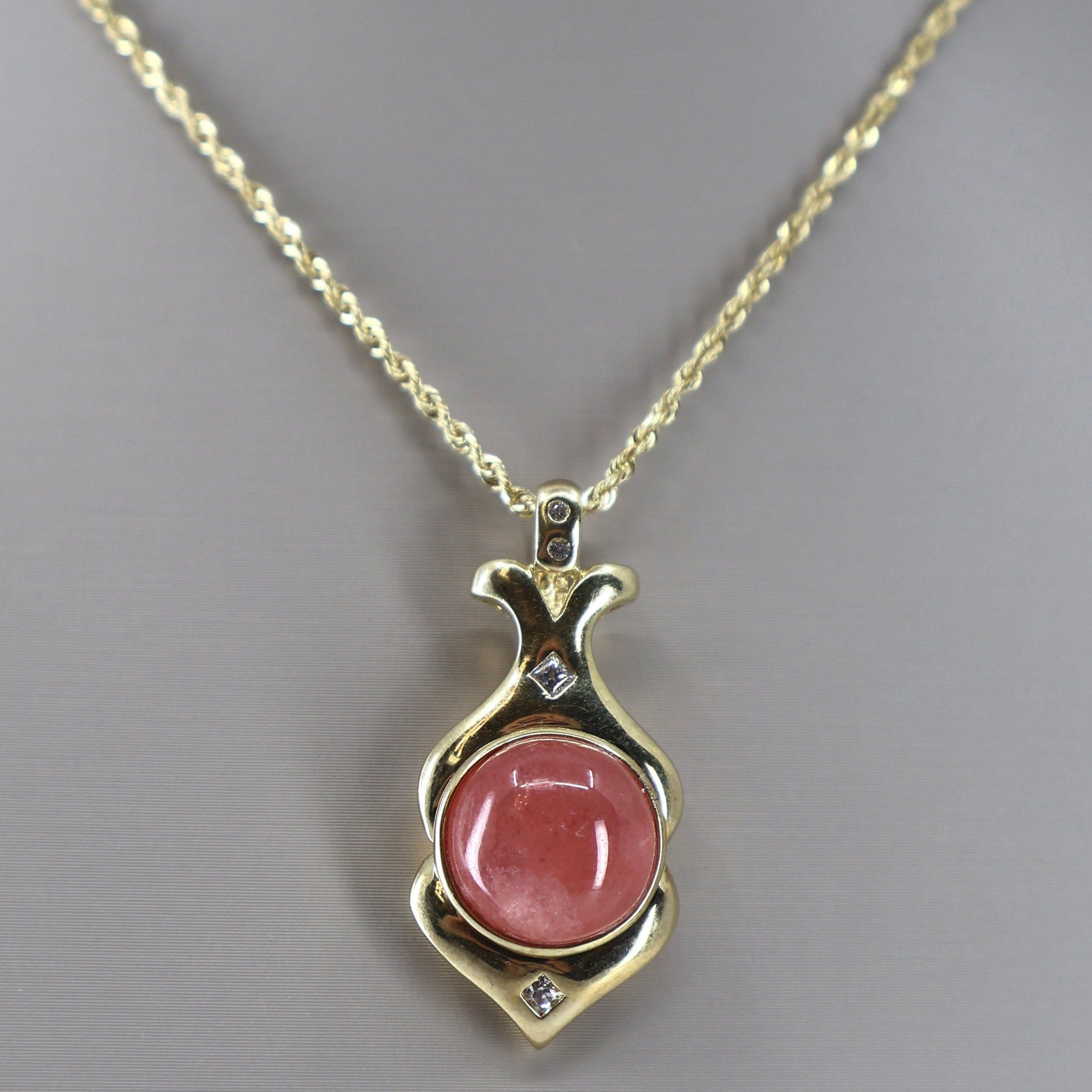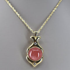 Crafted in 14K yellow gold, this elegant pendant features a vibrant pink round coral centerpiece. Accentuated by two diamonds on the bail and one diamond on each side of the coral, this piece combines refined design with subtle sparkle. Its classic yet distinctive style makes it a sophisticated addition to any jewelry collection.
