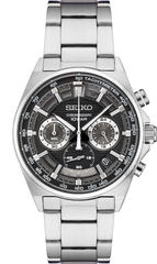 From the Essentials Collection. Inspired by racing, this rugged chronograph combines functionality and fashion for perfect sport or everyday wear. Framed by a black tachymeter outer ring, the dimensional embossed black dial features applied metallic elements and gray accents. Designed to resemble an engine compartment, the dial also offers three subdials, including a 24-hour indicator, a date calendar, and LumiBrite hands and markers. Chronograph timing provides measurement of up to 60 minutes of elapsed time in 1/5-second increments. Crafted of stainless steel. 10 bar, 100M Water Resistant